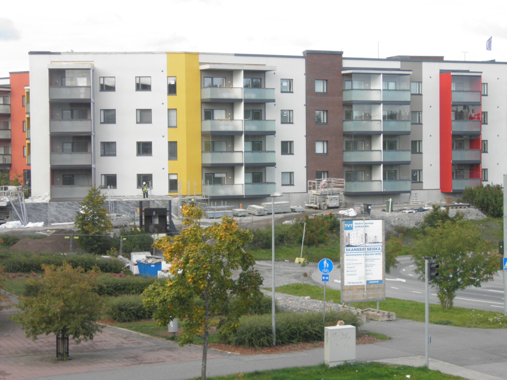 On ollut hienoa kokemusta katsella näitä ihmismuurahaisia. En ole koskaan ennen elämässäni asunut tällaisella paikalla, johssa on näin upea tilaisuus seurata suurrakennuksen syntymistä – ihan alusta asti. Koko ajan tapahtuu, herkeämättä muurahaiset touhuavat: hakkaavat poraavat lapioivat nostavat vetävät työntävät pyörittävät roikottavat. Kuuluu kilkatusta kalkatusta sihinää suhinaa hakkaamista tai sementin pyörittäjän hurjaa meteliä. Mutta ihmisen ääniä ei kuulu. Kukaan ei huuda eikä kiroile. En ole kuullut ainuttakaan kinastelua. Se tuntuu hienolta. Seiniin syntyy pintaa laajoin vedoin, ikkunoissa alkaa kiiltää lasi, peittyy muoviin, syntyy pookat ja kehittyy monet parvekkeet, niiden reunat ja kaiteet. Haitarinosturilla ahertaa keltainen muurahainen seinien teossa: tiili tiililtä kasvaa kaunis pinta, viereen toisenvärinen.