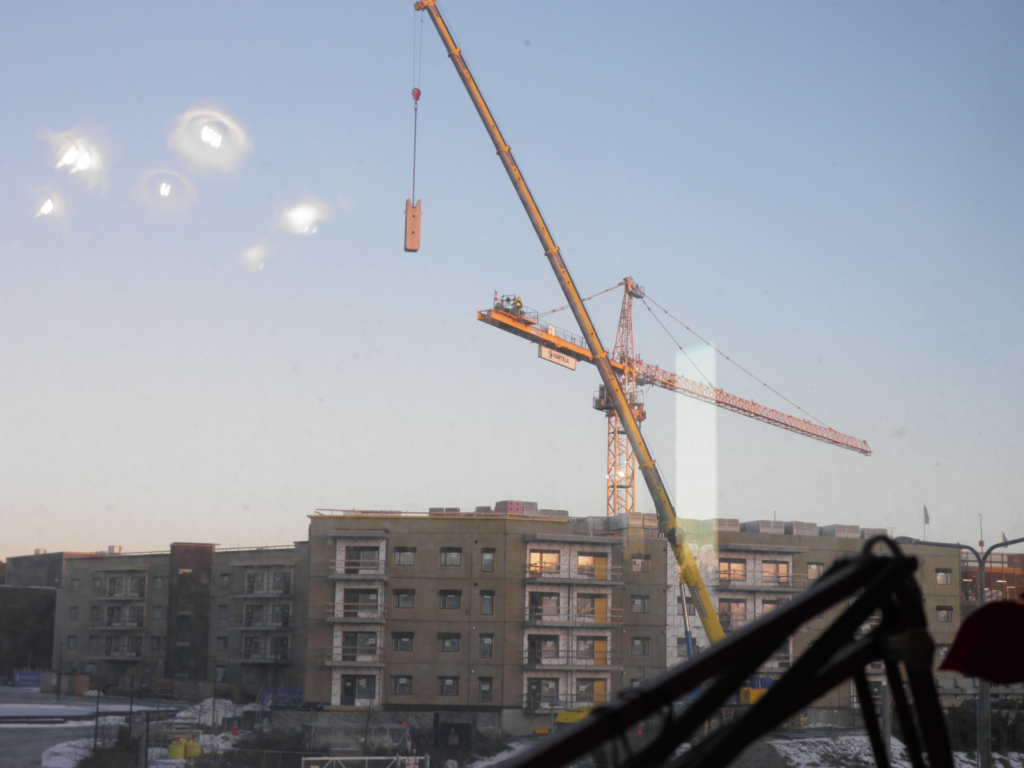 Jokin päivä sitten rakennuksen tälle puolen siirrettiin valtava valkoinen ”mylly”. Nyt ymmärrän, mitä se tekee. Työmaan reunaaan tuodaan aika ajoittain suuri määrä valkoisia säkkejä odottamaan jotain käyttöä. Nyt alkoi tapahtua.