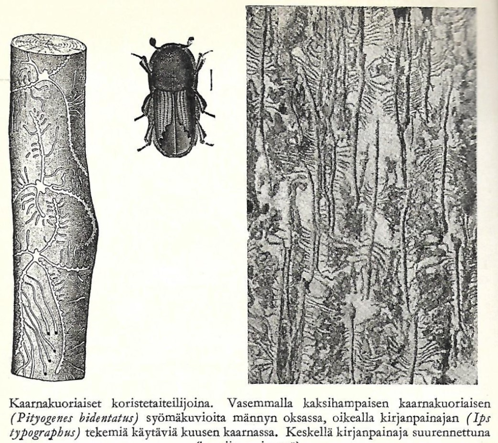 Kuoriaistenväri on nopeasti nähtynä mustan-sinivoittoinen ja kiiltävä. Tarkemmin katsoessa näkee kuoriaisissa monia värejä, oikein värihehkuja. Muistan, miten lapsena muurahaisten lisäksi katselin puutarhassa miellellään kuoriaisten touhuja. Joku niistä touhusi usein isän vierasvara-kessumaalla. Seitsenpistepirkko taitaa leppäkertuista olla tutuin. Arvelen, että en nähnytkään kirjanpainajaa enkä oppinut tuntemaan sen työn jälkeä. Jos olisin nähnyt, kyllä muistaisin. Seuraavassa kerron tästä luonnon kaivertajasta enemmän ja lisäksi jännittävää tarinaa.