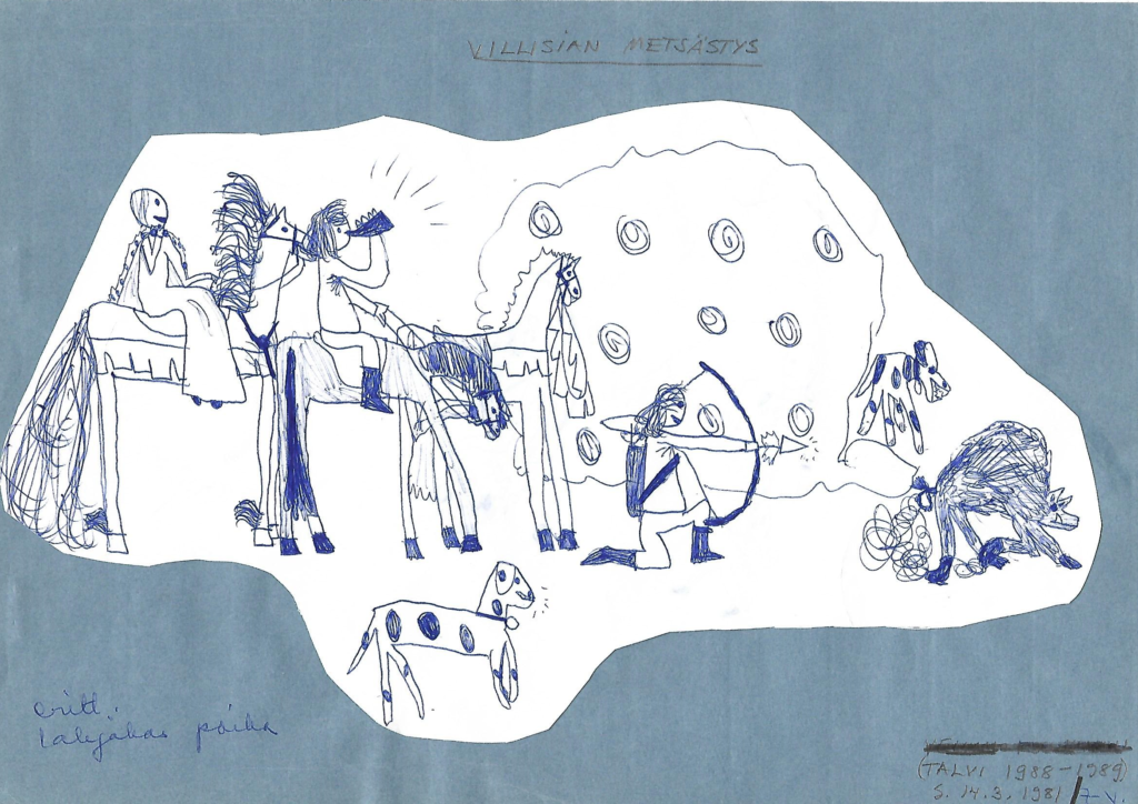 KUVA 3. Erittäin mielenkiintoinen 7-vuotiaan pojan piirros ”Villisian metsästys”. Upea ja rikas näkemys, jossa kiinnityyy huomio kuvauksen tarinanomaisuuteen ja moniin yksityiskohtiin. Kolme hyvin erilailla käsiteltyä hevosta, nainen istuu vinottain naisensatulassa, (äärimmäisen harvinaista kuvata aikuisenakaan), on metsästystorvensoittaja ja jousipyssyllä ampuja, kaksi metsästyskoiraa ja villisika, jonka olemus on kuvattu aivan liikuttavasti ( ja ironisestiko?). Uskomaton kynän käyttö, erinomaisen varma eläinten ja ihmisten hahmotus. Kuvassa voi jopa nähdä liikettä ja vauhtia ja huumoriakin. Villisika näyttää kovasti pelokkaalta ja tupruttaa jotakin takapuolestaan. Onko lisäksi pilvenomainen alue villisian takana hajupilveä? Tämä pojan on annettu piirtää jo kauan, todennäköisesti hänelle on luettu jo kauan ja myös paljon, hän on varmasti korkeatasoisesti älykäs ja hänessä on moninaista lahjakkuutta ja ilmaisukykyä. Oikeastaan on lähes mahdotonta uskoa, että 7-vuotias pystyy tällaiseen suoritukseen, joka saattaaisi olla monelle aikuisellekin vaikeaa. Piirtäjän ei liene aina helppoa hyväksyä kasvatuksen antamia normirajoja, vaan hän haluaa kulkea paljon omia teitään. (Olisi hienoa tietää, mitä tälle nykyään n. 43-vuotiaalle, entiselle erityislahjakkaalle pojalle tällä hetkellä kuuluu. Minkälaisessa ammatissa hän saa toteuttaa suurta lahjakkuuttaan?)