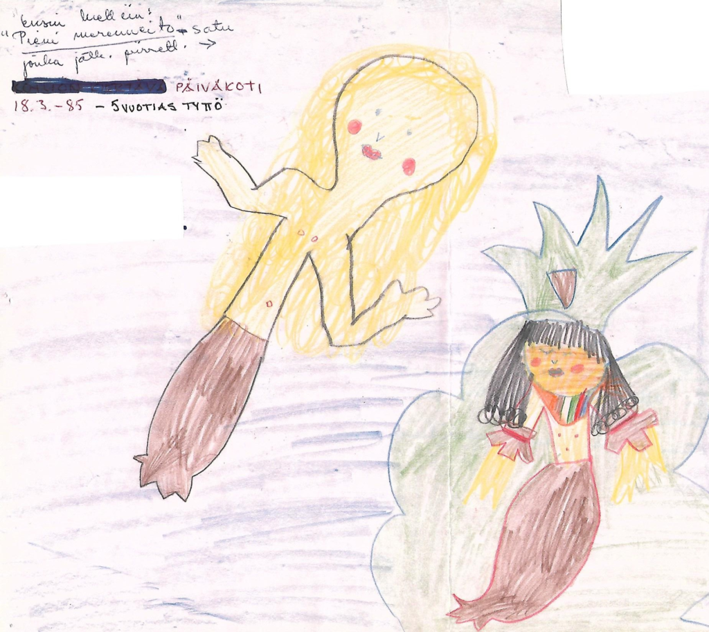 KUVA 1. Päiväkodissa luettiin ensin ”Pieni merenneito”-satu ja sitten piirrettiin kuva siihen. 5-vuotias tyttö piirsi tämän. Päiväkodin henkilökunta oli saanut päiväkotikäynneilläni alustavaa tietoa piirrosten tulkinnasta ja niiden hyväksikäytöstä. Heidän mielestään tämä kuva oli sekä piirroksena erinomaista tasoa, mutta myös jotenkin outo. Pikkutyttö tuntui erityislahjakkaalta. He toivat kuvan minulle ja totesin lapsen selkeän lahjakkuuden ikätasoon nähden. Jotain tarkkailtavan terpeellista oli lapsessa itsessään sijoittaessaan kuvan hahmot ikäänkuin suljettujen verhojen sisään. Tarkkailin tyttöä myöhemmin ala-asteella, jossa tarvittiin psykologin apua. N. 13-vuotiaana tytöllä alkoi voimakkaista mielenterveyden häiriöitä autistiseen suuntaan niin, että häntä oli hoidettava jaksoja sairaalahoidossa.