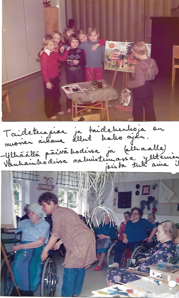 Terveyskeskuspsykologina minulla oli tilaisuus pitää taidekerhoja ja tehdä taideterapiaa samassa rakennuskompleksissa sijainneen vanhainkodin asukkaiden kanssa. Teimme ihastuttavia töitä, joita ripustettiin vanhainkodin seinille ja annettiin lahjoiksikin.