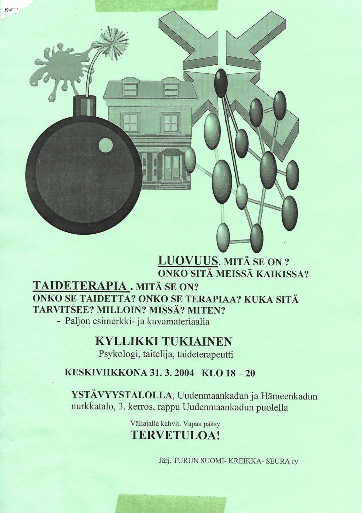 Olen ollut mukana Suomen Taideterapiayhdistyksessä ja yhteisissä näyttelyissä monia vuosikymmeniä, ja sitä kautta saanut tutustua Suomen taideterapian kenttään silloisia johtoportaita myöten. Sain yhdistyksen eri tilaisuuksissa monia ystäviä, jotka innostivat jatkamaan omaa taideterapiatyötäni. Tätä kautta olen saanut myös suuret määrät taideterapian tutkimustietoa ja kuvallista materiaalia. Taideterapeuttina pidin luentoja ja koulutuksia yliopistossa, joissakin oppilaitoksissa, opistoissa, hoitolaitoksissa kuten esim. vanhainkodeissa ja kulttuuritilaisuuksissa ympäri Suomea. Aina koin, että ihmiset olivat erittäin kiinnostuneita luovuuden asioista. Ja se innosti minua yhä enemmän luovuuden pariin.