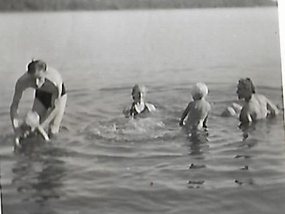 Kuvassa alla näkyy pätkä kapeaa laituria ja matalalle sijoitetun tervapahvisaunan seinää, sekä isä seisomassa saunan oviaukossa, äidin Lahja-sisko makaamassa laiturilla seinän vierustalla, Jussi-veli (n. 2,5 v) pyrkimässä laiturille ja minä (3,5 v) istumassa seinän vieruspenkillä. Istun selkä oudon suorana ja ilme yrmyisenä. Tämä kuva on herättänyt minun ensimmäisen lapsuusmuistoni. Muistan, miten selkääni poltti ja olin vihainen isälle, joka käski minut siihen istumaan. Miksi istumaan juuri siihen, en muista. Jotain pahaa mieltä aiheuttanutta tilanteessa oli. Äiti todennäköisesti on ottanut kuvan. Äiti ei yleensä osannut kuvata, jotain jäi aina pois, henkilön pää, oli huono kuvakulma jne.