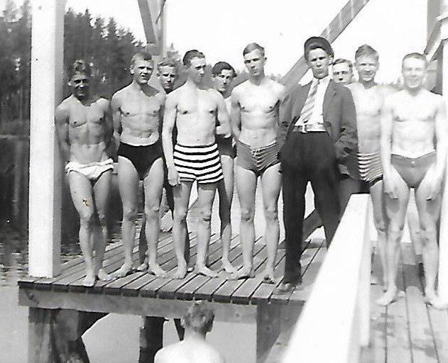Kuvassa ylhäällä on isä arvelujeni mukaan oppikoulun lukiokavereittensa kanssa jossakin Mikkelin vesien uimalaitoksen hyppytornissa. (Olisipa hauska tietää, ketä kuvan muut pojat ovat.) Isä kuvan vasemmassa laidassa on selkeästi aika uskalias sen ajan uima-asuja ajatellen. Mielestäni hän ei ole tässä pelkästään leikkisä ja hyväntuulinen, vaan jopa hiukan ”koketeeraa” kuvaajalle. Hänen lisäkseen vain yksi poika nauraa, muut ovat jokseenkin vakavia ja yksi ei taida omistaa uimahousujakaan, mutta korvaa puutteen olemalla kovasti reteesti samaa porukkaa. Tässä vaiheessa isä oli lähes laihapoika. Mutta niinkuin näkyy hän oli ikätovereittensakin joukossa suhteellisen pienikokoinen ja lyhytraajainen savolaiseen tapaan eli ”takapuoli laahaa melkein maata”.