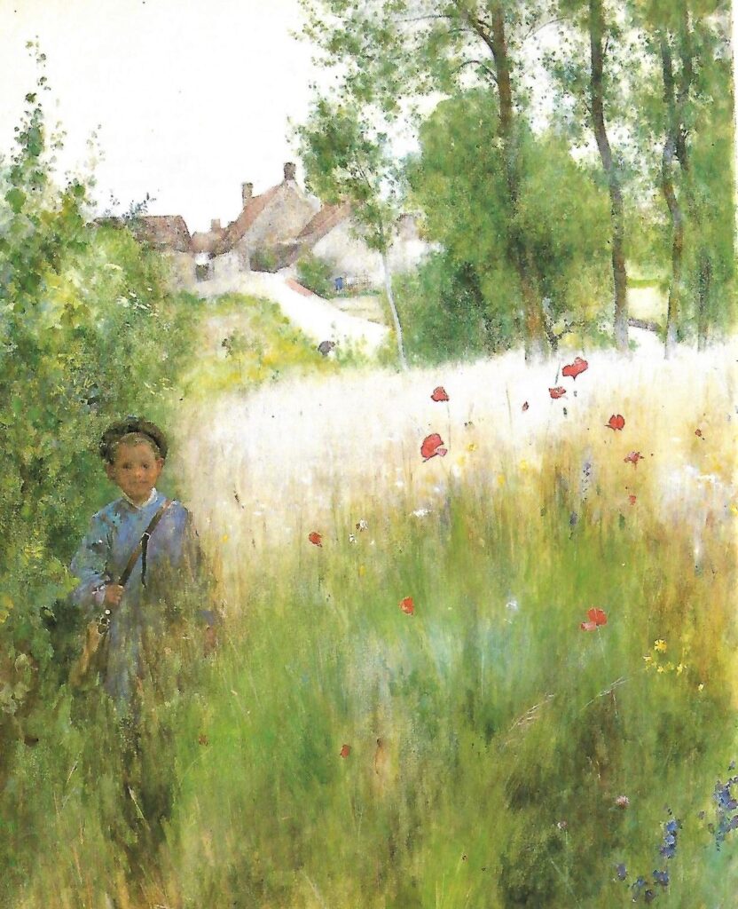 Yllä oleva Carl Larssonin täydellinen akvarelli ( Unikkoja, 1884 ) kuvaa osaa siitä ihanasta tunteesta, jota koin viljapeltouinnissa. Voin kuvitella ja tunteakin pienen pojan kulkemassa olkalaukkuineen pitkin kedon reunaa, kun valo on suurta ja maailma nautinnollisen kaunis. Tämä suurenmoinen taideteos välillä virkistää ja antaa ehkä lukijalle samantapaisia elämyksiä ja kutituksia kainaloon kuin minun lapsuuteni viljapellon vehnäntähkät.