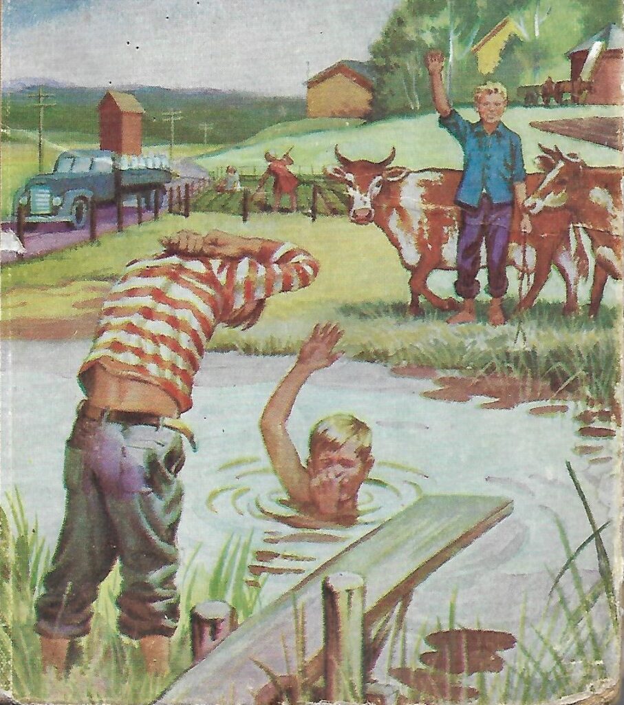 Voi sitä kirkumisen ja lätkimisen iloa aina siihen asti, että joku viisas aikuinen kielsi sen, todennäköisesti tulehdusten pelossa. Ehkä iilimatoja alkoi olla liikaa. Meille lapsille tuli vaikea tilanne: mistä löytyisi uimapaikka. Kotoa pappilasta oli tänne halki kylän aika matka ja uimareisumme olivatkin venyneet pitkiksi, vaikka oli tietysti eväitäkin mukana. Siinä vaiheessa sain oivalluksen: miksi emme voisi uida Larilan vehnäpellossa – paremman puutteessa?