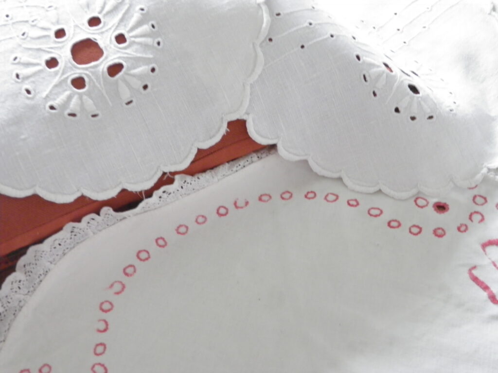 Olen tämän nyt 62 vuoden kuluessa ja monissa muutoissani antanut ehjiä liinavaatteita ja reikäompeleita pois lähinnä, kun ei itsellä ole ollut tilaa käyttää pöytäliinoja ja koruompeleiset liinavaatteet kun ovat niin hankalia pestä ja huoltaa. Viimeisille liinavaatteille mietin omistajaa parhaillaan.