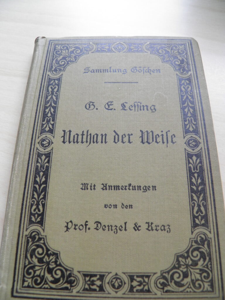 Vanha hopeasolki tihkuu yhä vain uutta muistoa minulle. Minulla on käsissäni kaksi maailman kirjallisuuden hienoimmista töistä sekä ulkonaisesti että sisällöltään. Pienempi, maanvihreisiin, kauttaaltaan ornamenttikuvioituihin kangaskansiin sidottuna Gottfried Efraim Lessingin Nathan der Weise. Kansiin liimattu tiheään painettuja tekstejä, joista saan salvää, että pieni teos on painettu Stuttgartissa, todennäköisesti 1892, erityispainos, 80 penniä.En osaa kertoa, kuinka rakastankaan tätä pientä ihanaa, rikasta ja kaunista teosta! Tässä on sivuja vain n.180 ja teksti tietysti kautaaltaan hyvin kaunista fraktuuraa, goottilaisin kirjaimin.