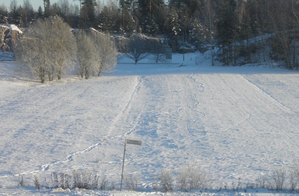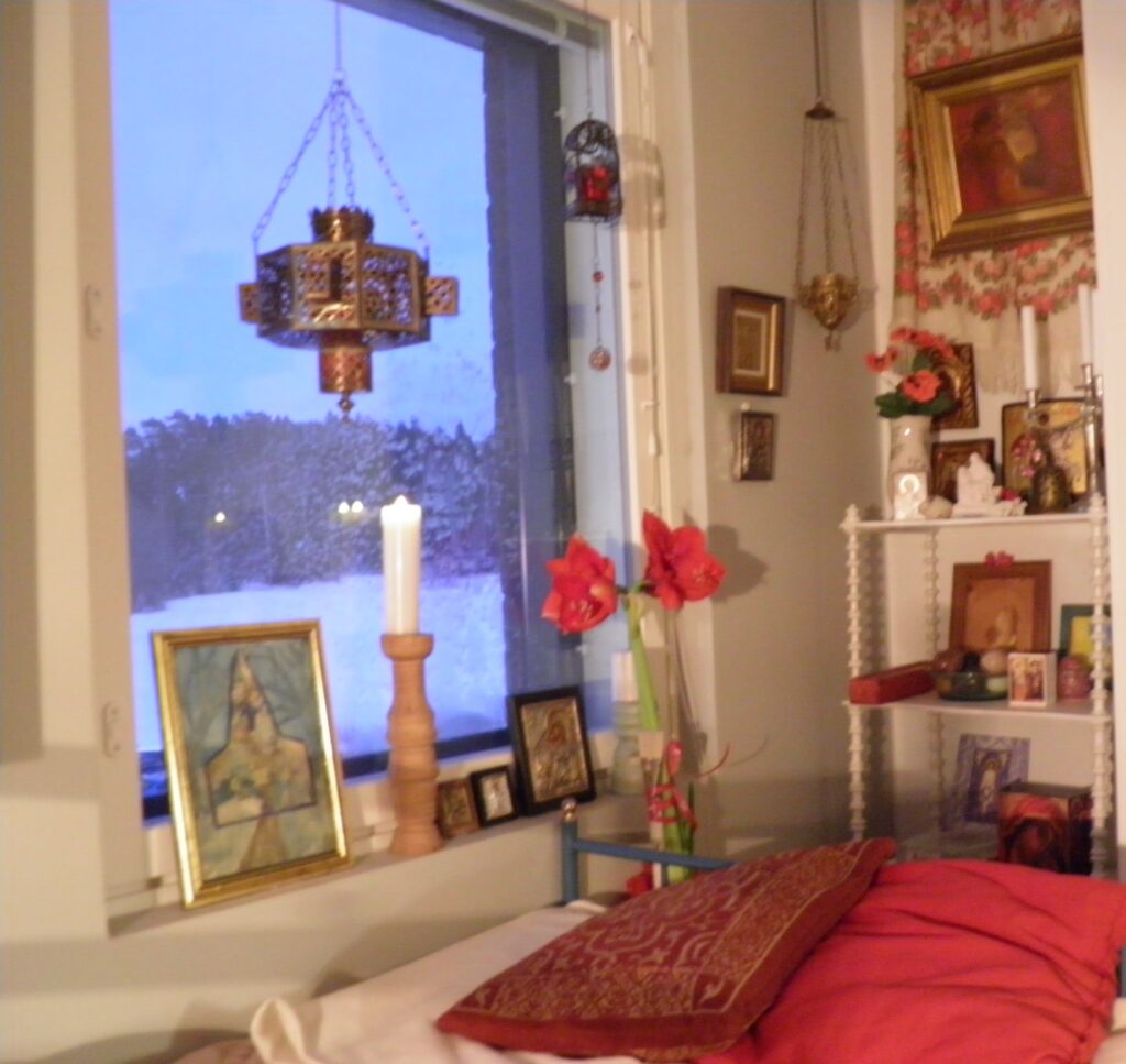 Aurinko nostaa luomiaan ja luo sinisiä varjoja hangelle. Kettu juoksee yli pellon ja jättää jäljet. Vanhus sammuttaa sinisen lamppunsa ja katselee ikkunasta. Talvi kirjoo maisemaa, jättää kauniin jäljen. Ja ikonostasissa hymyilee Äiti-Maria.
