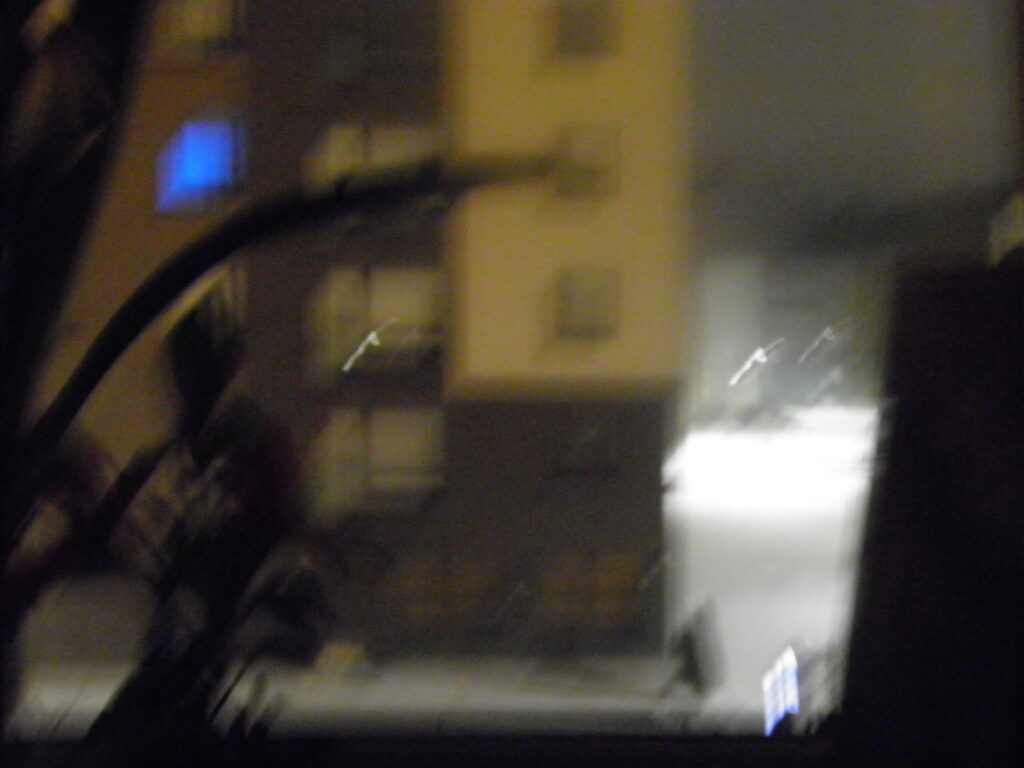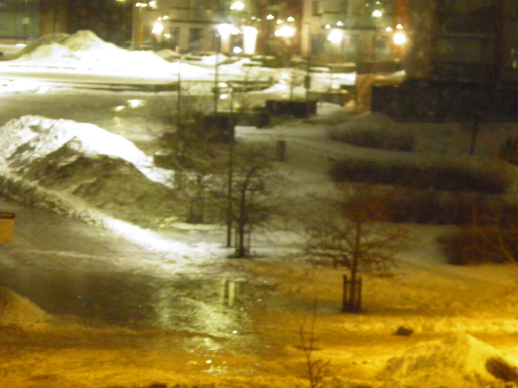 Pimeä taivas sataa vettä. Kaduilla kasvaa pieniä lampia. Jäätyneet lammikot hohtavat valoa yöhön.