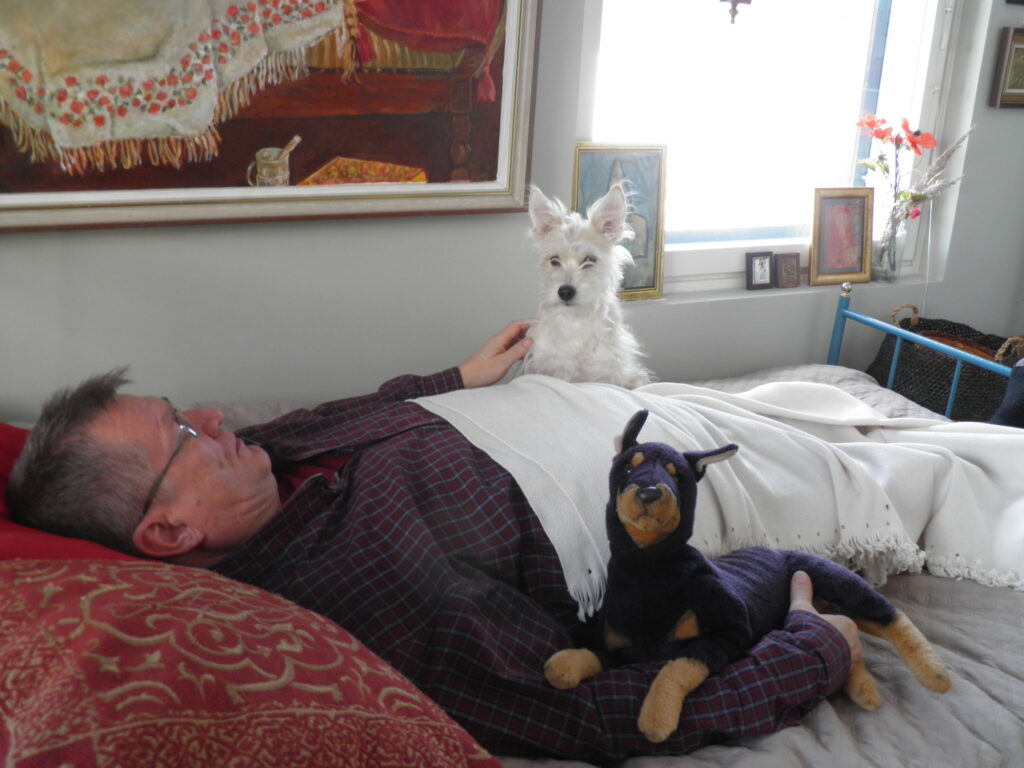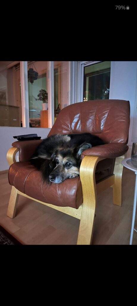 Vanha koira haluaa nukkua rauhassa… kuin pesässä. Kyllä sitä nuorena nukkui vaikka isännän jalan päällä….On niin kipeät paikat taas. Mutta minä en ala nilkuttaa, ennenkuin on ihan pakko. On se nähty: vanhat koirat puistossa… Nuoret kohta päälle pissaa… Mutta hyvinhän tässä kävi, kun pääsin oman paikkaan. Tämä tuolinnahka on niin sopivantuntuista karvalle oli sitten kuuma tai kylmä ilma… Ja tästä näkee kaiken. Näkee ovelle, kuka menee tai tulee, näkee keittiön puolelle ja ruokakupille ja näkee koko huoneen, missä ne liikkuu.Voi vahtia, kuka menee ulko-ovelle. Pian tulee minunkin aika päästä pihalle… Mutta nyt alkavat repiä noita paketteja auki, heittelevät papereita ympäriinsä. Sekoavat kokonaan. Äsken keräsivät niitä yhteen kasaan ja nyt… Kyllä minäkin nyt yhden paketin revin… On minulla vielä hampaat. En ole mikään irvileuka rääkki.