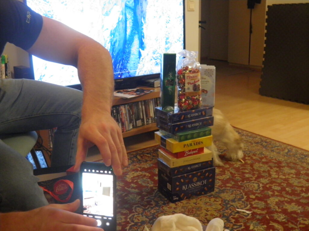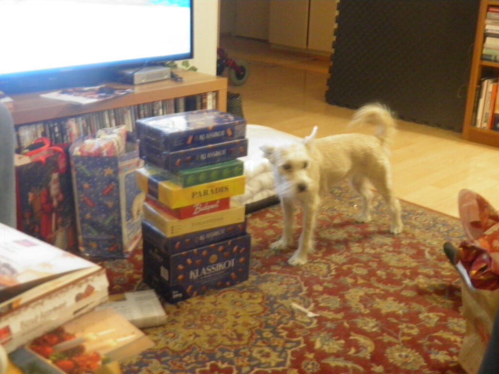 Oli ääntä talossa, kun lahjoja ihailtiin. Laulettiin yhdessä kaikkein tutuimmat joululaulut: Maa on niin kaunis ja Jouluyö. Äkkiä Dixi hyppäsi tuolista lattialle ja tunki keskelle huonetta paperikasaan. – Nostelkaa papereita tähän suureen paperikassiin! Se varmaan tarkoittaa. Että mahtuu koiratkin. Minä sytytän takan, sanoi isäntä. Ja taikatempunhan hän teki: luonnollisen kokoinen takka syttyi seinustalle. – Oho! Onpa todellinen! Vielä rätiseekin! Kaikkea sitä keksitään, ihmettelin minä. Dixillä oli energiaa: se nuuhki sieltä täältä ja haisteli poikien jaloissa, oliko mitään suuhun pantavaa herkkua. Joskus pojat tipauttelivat taskuistaan makupaloja. tahallaan tai huomaamatta tällaisessa tohinassa. – Nyt, pojat kaikki suklaarasiat yhteen pinoon! Minä otan kuvan todisteeksi, että teitä… meitä hellitään ja lihotetaan. Maire viereen suklaavuoren mittatikuksi!